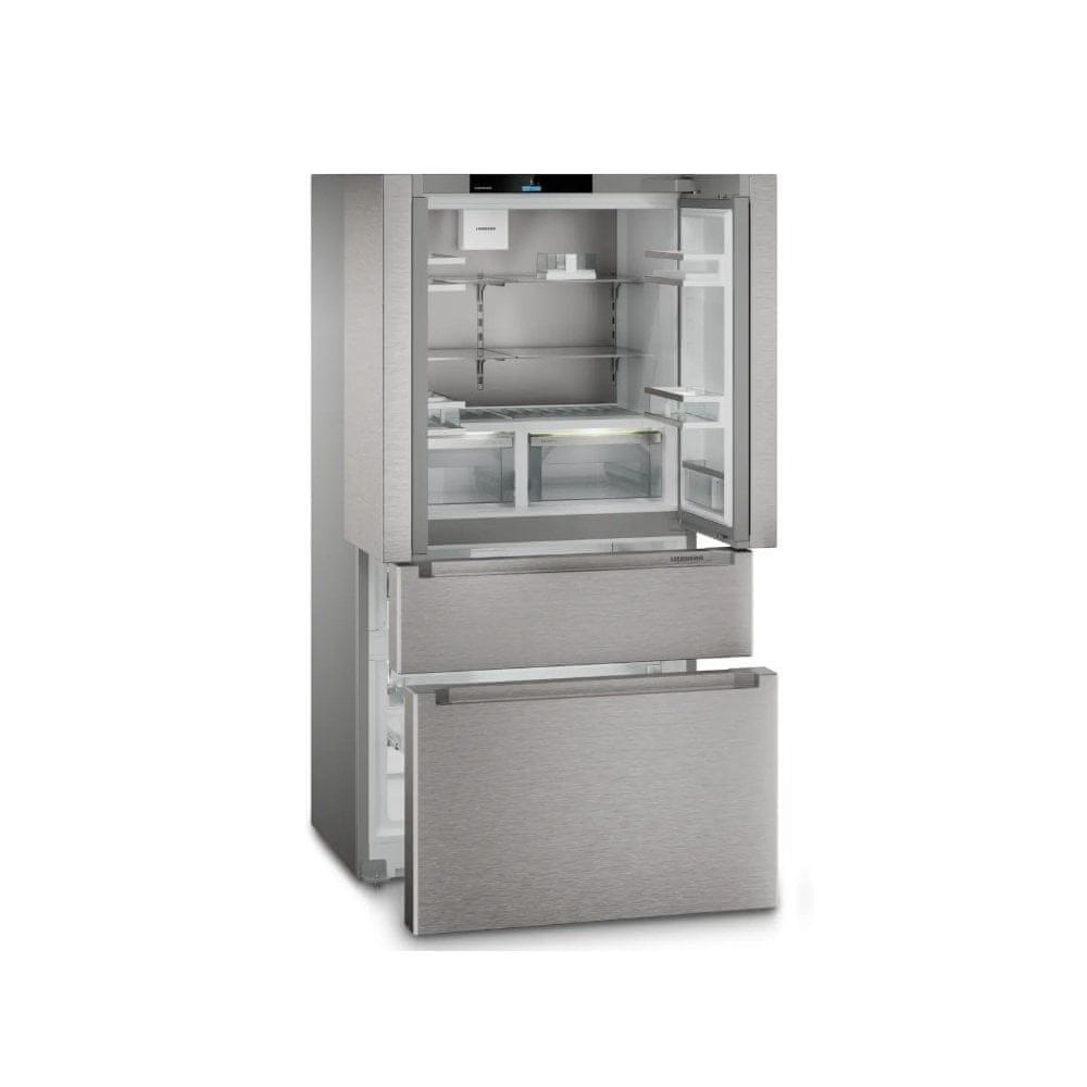 Hladilnik Liebherr MBsddi 9524 s svojo zasnovo francoskih vrat in dvema zunanjima zamrzovalnima predaloma nudi maksimalno udobje in preglednost. Tehnologija BioFresh v predalih na teleskopskih vodilih SoftTelescopic ohranja idealno temperaturo tik nad 0 °C, kar zagotavlja, da sadje, zelenjava, meso in mlečni izdelki ostanejo sveži bistveno dlje. Srebrna izvedba SmartSteel pa poskrbi za moderen videz, ki je odporen na prstne odtise.