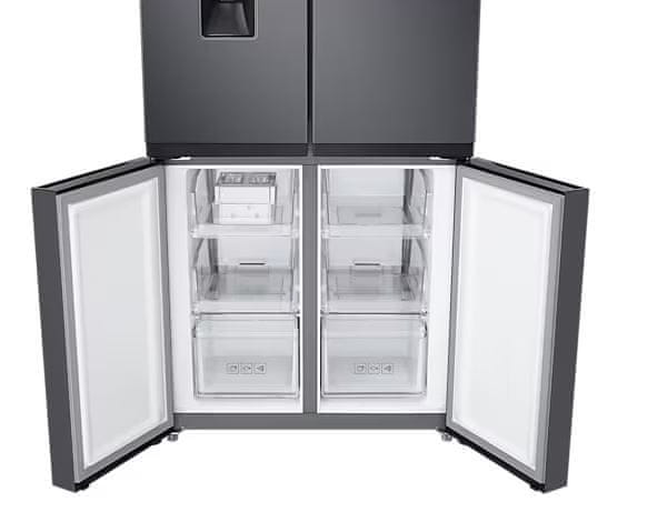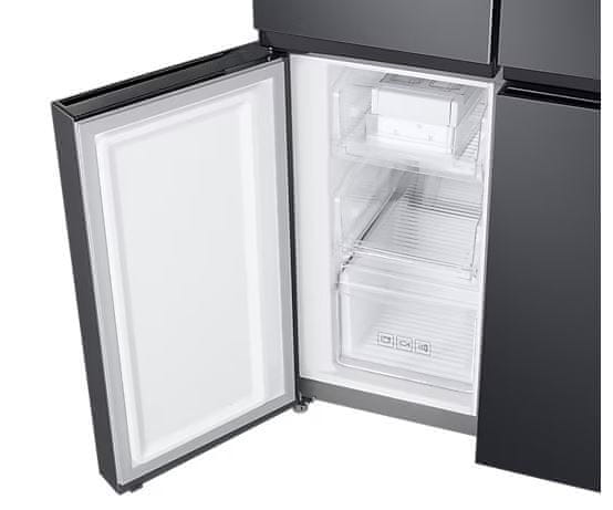 Ameriški hladilnik s francoskimi vrati nudi 329 l hladilnega in 159 l zamrzovalnega prostora. Zaradi digitalnega inverter kompresorja zagotavlja naprava samodejno uravnavanje delovanja glede na potrebo po hlajenju, kar privede do tišjega in energetsko varčnejšega delovanja. Hladilnik je opremljen s tremi policami, dvema predaloma in dodatnimi vratnimi poličkami. Od tega je en predal oblikovan s kakovostno zatesnitvijo, ki vzpostavi idealno okolje z optimalno vlažnostjo za sveža živila. Zamrzovalni del pa se ponaša s štirimi policami in dvema predaloma. V zamrzovalnem prostoru se nahaja premični ledomat, ki vam v poletnih dneh naredi veliko količino ledu, v zimskem času pa ga lahko odstranite in s tem povečate prostor za shranjevanje živil. Poleg tega je opremljen z vodnim rezervoarjem brez BPA, zaradi česar boste imeli vedno dostop do osvežujočega kozarca hladne vode.