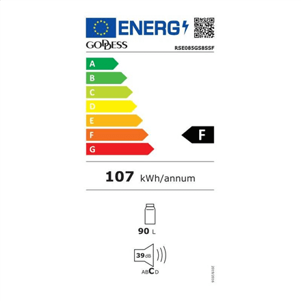 shumee Goddess | GODRSE085GS8SSF | Hladilnik | Razred energijske učinkovitosti F | Prostostoječi | Shramba | Višina 85 cm | Neto prostornina hladilnika 90 l | 39 dB | Nerjaveče jeklo