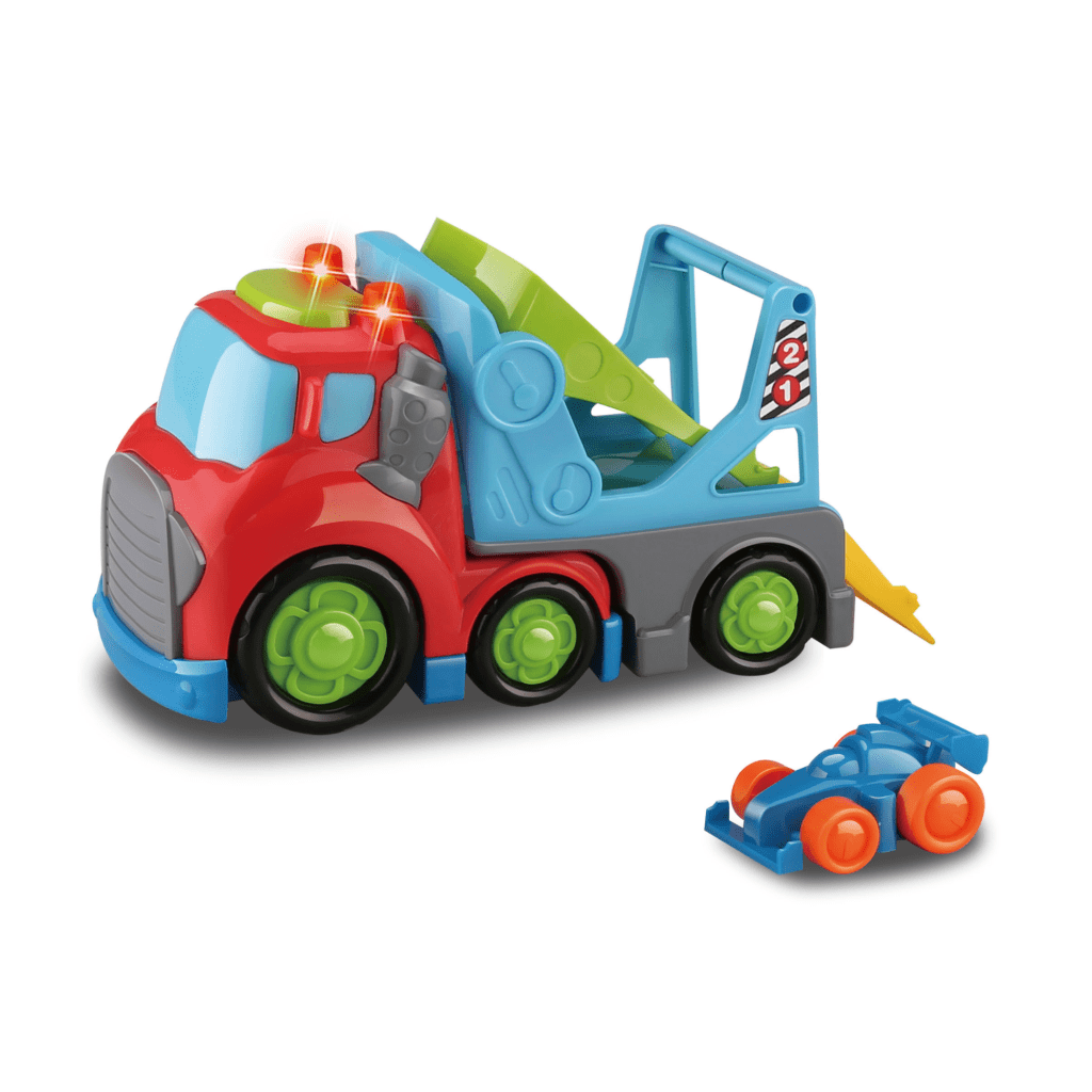 Kiddy Go! Prevozno vozilo z učinki. Paket vsebuje 19,5 cm velik avto in 6,5 cm majhen avto. Prevozni avtomobil ponuja svetlobne in zvočne učinke za dodatno zabavo. Učinki se aktivirajo s pritiskom na gumb na strehi kabine. Kolesa v prostem teku. Avto potrebuje baterije 2×AA, ki so priložene. Primerno za otroke od 18 mesecev dalje.