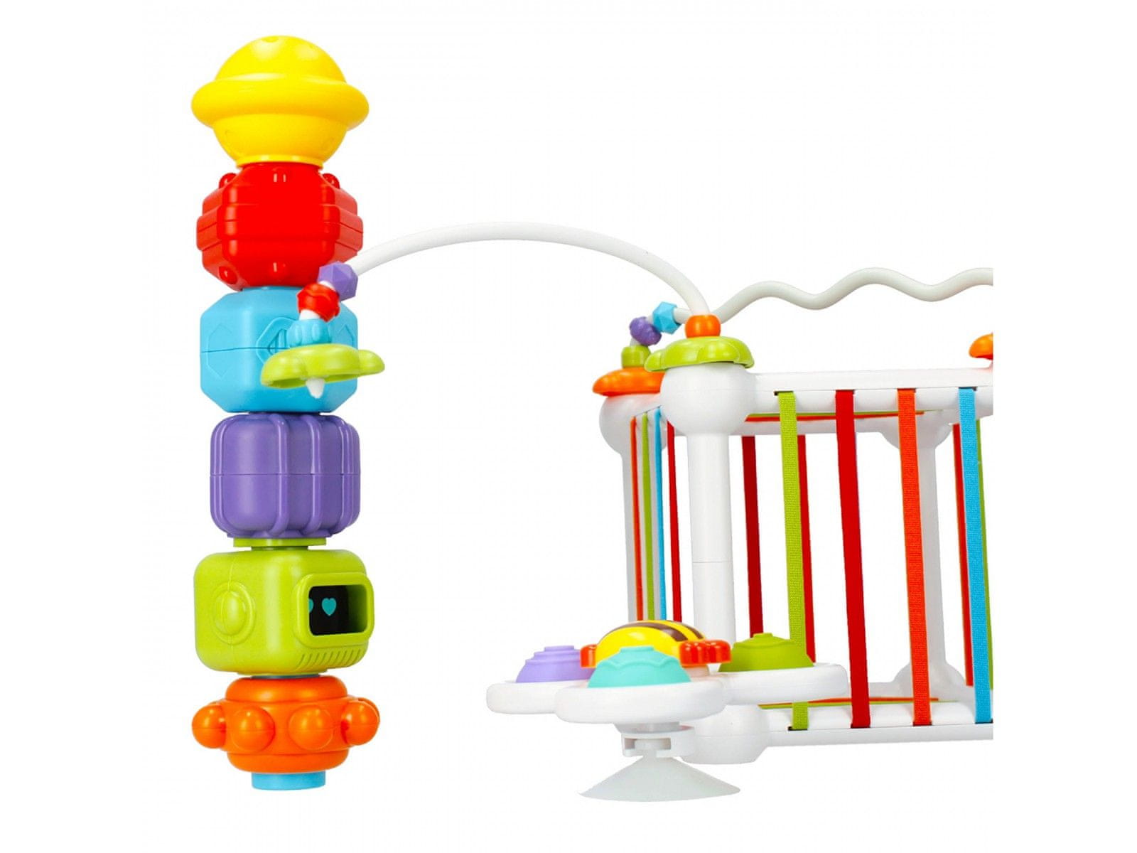 Sortirnik, ki je priložen k kockam in ima stranice prepletene z barvnimi gumicami, odlično služi kot sortirnik in škatla za igrače ter kot opora za ostale dodatke.
