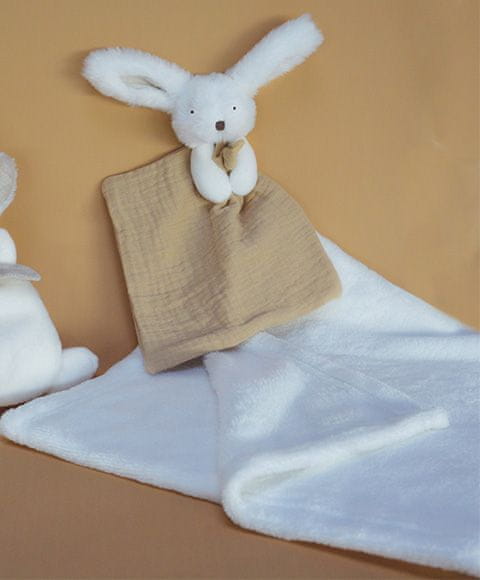 Prikupni zajček in plišasta mehka odeja sta zasnovana tako, da otroka pomirjata, mu nudita udobje in ga ščitita. Praktičen komplet, ki vas ne bo pustil na cedilu doma ali na sprehodu. Zaradi subtilne harmonije modnih barv, mešanic zelo mehkih materialov bo ta komplet zelo prijeten za dojenčke. Idealen tudi za darilo. Operite v kopeli pri 30°. 30 °C, sušenje na naravni ali nizki temperaturi. Glavne značilnosti: mehek pliš, vrhunski materialskladen z evropskimi standardi CEprimeren od rojstva