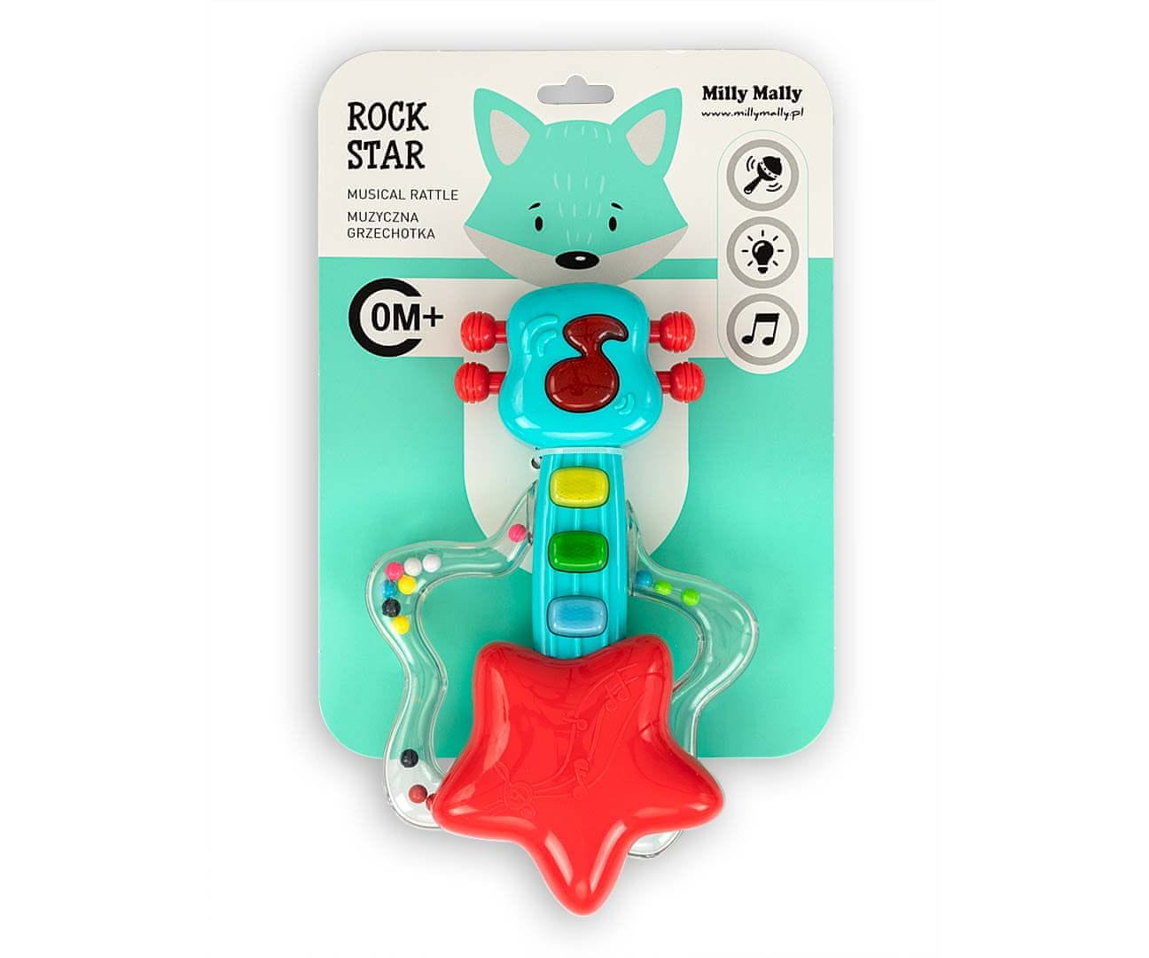 Predstavljamo glasbeno kitaro, ki igra šest razburljivih melodij inima svetlobne učinke. S pritiskom na gumb v obliki note na vrhu lahko preklopite iz glasbenega načina v način instrumenta. Naša kitara ima ročaj, ki ga otrok lahko zlahka prime. Je prozoren, tako da otrok lahko vidi barvite kroge znotraj, ki se premikajo z vsakim gibom, in se lahko uporablja kot ropotuljica. Vsak element kitare Milly Mally je zasnovan in premišljeno oblikovan, da podpira pravilni razvoj otrok. Na vratu kitare so trije glasbeni gumbi, ki spodbujajo otrokovo radovednost. Gre za ropotalko, ki spodbuja čute, kar je pomembno v zgodnjih fazah otrokovega razvoja. Pri uporabi te igrače otrok prejema dražljaje, spodbujajo se njegove fine motorične sposobnosti, tj. razvija nadzorovane in natančne gibe, vključno z izražanjem obraza, razvija pa se tudi njegova občutljivost za zvoke. Druga dragocena prednost je koordinacija med rokami in očmi. Igrača pomaga otrokom razviti močnejši občutek