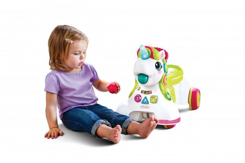 Najmlajši otroci se bodo s pomočjo svetlečih gumbov in zvokov učili barv, oblik in številk Nato jo lahko, ko bodo naredili prve korake, uporabljajo kot igračo za potiskanje tako, da držijo ročaj na hrbtni strani sedeža Sedež se dvigne za hojo in spusti za jahanje, vključuje pa tudi predal za shranjevanje žogic Za dodatno zabavo ima samorog 20 zvočnih in svetlobnih učinkov Konjska griva je čudovito živahna in ima različne teksture, rog pa je izdelan iz mehkega materiala in se ob dotiku zasveti! In zdaj najboljši del! Voziček vsebuje 5 pisanih žogic, ki jih lahko postavite v košaro spredaj ali v predal za shranjevanje pod sedežem Samorog zbira raztresene žogice in jih nato meče na tla ali v košaro Hitrost koles je mogoče nastaviti za začetnike in napredne uporabnike
