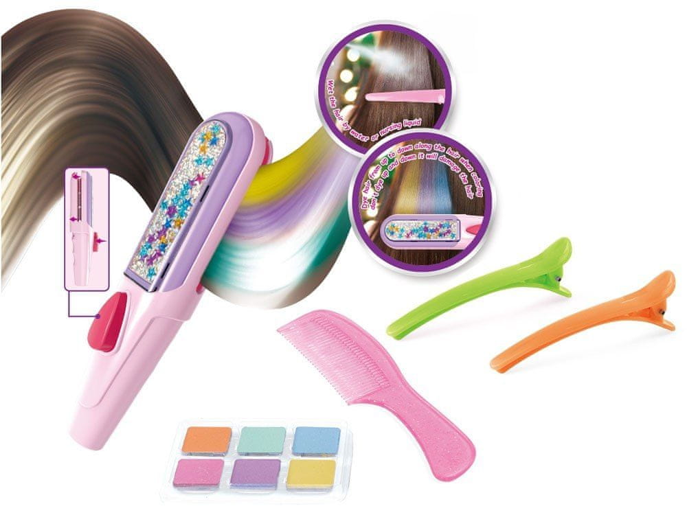 Ta barvit komplet bo zagotovil ure ustvarjalne zabave. Omogoča vam ustvarjanje čudovitih pramenov ali osupljivih pričesk. Zahvaljujoč 6 barvam lahko vsak dan ustvarite drugačno pričesko. Igranje s tem kompletom razvija otrokovo domišljijo in ustvarjalnost. To je odličen način za preživljanje časa skupaj z mamo ali prijatelji. Nova pričeska bo čudovit dodatek k vaši obleki za ples ali rojstni dan prijatelja.
