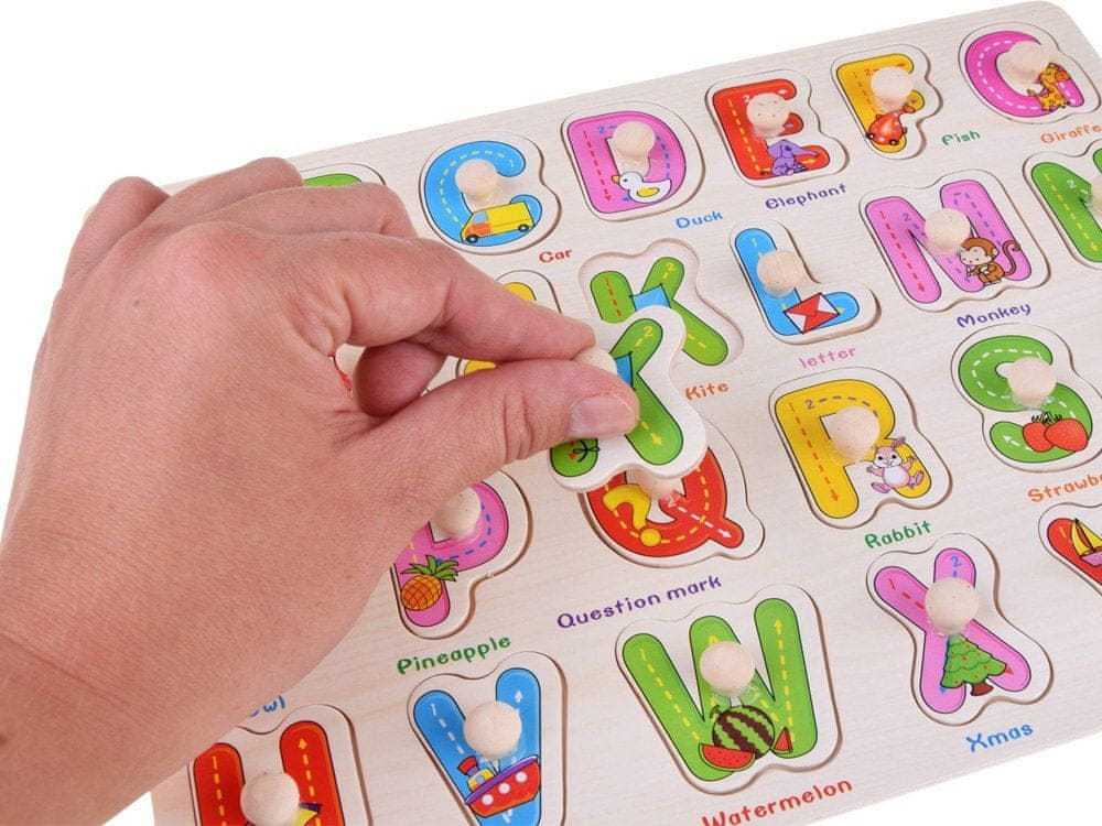 Ta lesena tabla z barvitimi črkami, , bo vašemu otroku omogočila učenje skozi igro. Tabla ima 26 barvitih, velikih črk z ročaji za enostavno odstranjevanje in vstavljanje. Poleg tega ima vsaka črka svojo barvo, sliko in ime v angleščini.