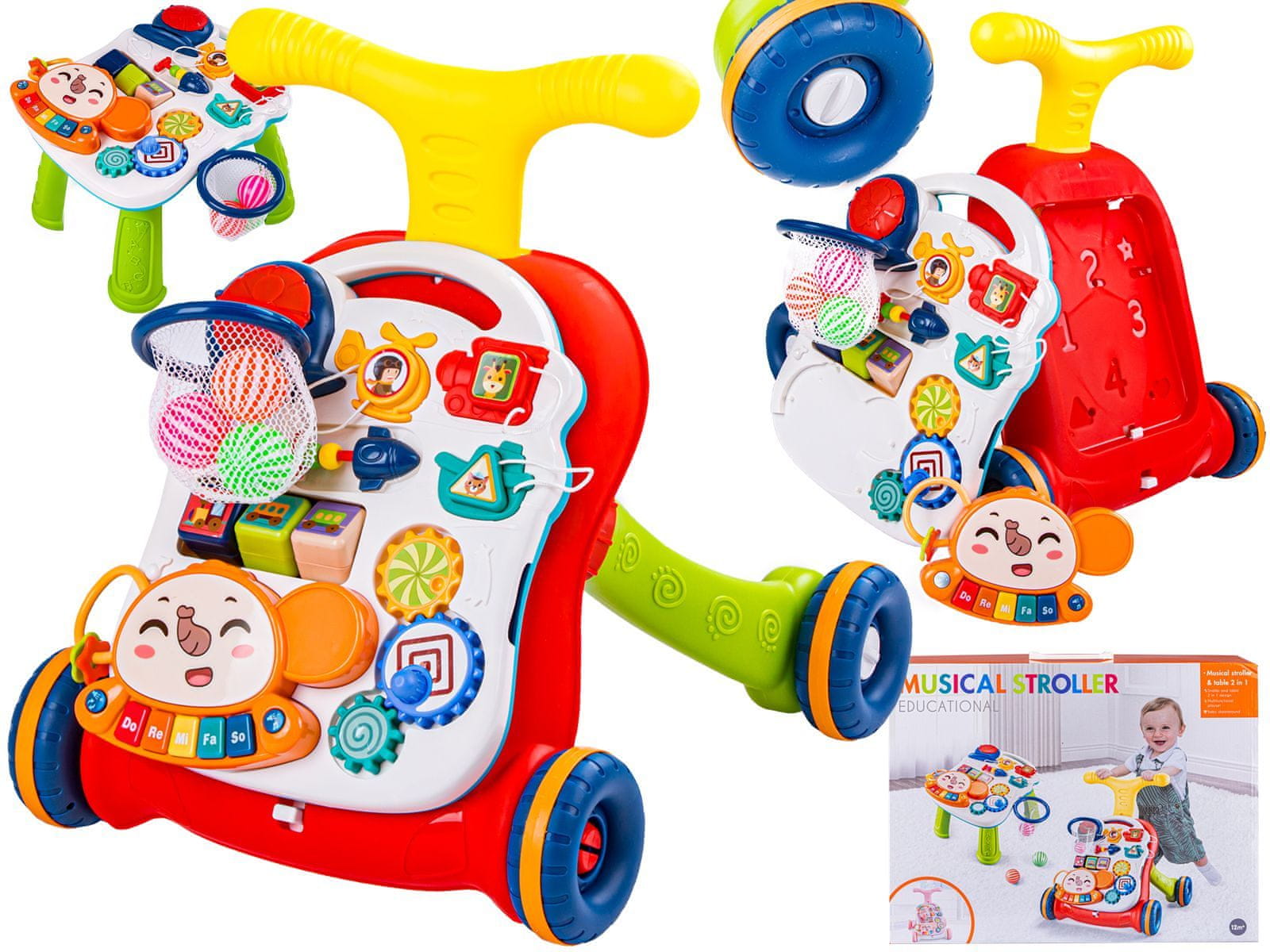 Večnamenska interaktivna rdeča Push Ride-On je fantastična poučna igrača, popolna za otroka, ki je že naredil prve korake. Zahvaljujoč kombinaciji več možnosti v eni igrači je poganjalec dobra izbira, ki bo vašega malčka zaposlila več ur. Nič ne bo tako razveselilo otroka kot igrača s presenečenji, ki jih lahko odkrijejo sami. In ta poganjalec ima veliko zanimivosti: Slon – mini orgle – je odstranljiv element, zahvaljujoč kateremu se bo vaš otrok glasbeno razvijal. Element ima 5 gumbov v različnih barvah. Ob pritisku bomo slišali vesele melodije in videli osvetlitev ozadja gumba, ki utripa z obrazom slona. Levi okrogel gumb je odgovoren za spreminjanje „teme“ zvokov: izbiramo lahko med barvami v angleščini, živalskimi zvoki (ovca, mačka, pes, ptice, žaba) + melodijo, naraščajočim zvokom Do, Re, Mi, Fa , Torej ali navadne melodije. Desni okrogel gumb spreminja same melodije. Slonovo uho je tudi naglavni trak z dvema rožama za premikanje – ima pokrovček, v katerega lahko skrijemo žogo. Če je plošča na hojici postavljena v navpični položaj, na čelado namestimo še košaro za žoge, iz katere lahko otrok glede na vrtenje oblikuje vlakec ali ljubko gosenico v obe smeri, Pisane kocke v treh oblikah jih jemljemo ven vendar počasi, ne izgubijo se, držijo jih na vrvicah – odlične bodo za učenje barv in oblik, Raketa – mini abakus z dvema perlama, Košarkarski koš – koš je izvlečen – ko je plošča postavljena v obliki mize – koš je vstavljen ob strani mizne plošče, ko je plošča postavljena na hojico v bolj navpičnem položaju – je koš postavljen v posebni odprtini v astronavtski čeladi. Potiskalnik ima še več presenečenj! Pod snemljivo ploščo so vtisnjene številke 1, 2, 3, 4 in oblike drugih predmetov (sonce, zvezda, trikotnik, srce). To je še dodatna zabavna opcija – ugani kakšne oblike ali številke je :) Velika kolesa z gumijasto zaščito zagotavljajo večjo stabilnost in tišjo vožnjo, Možnost namestitve košare tako na mizo kot na potiskalo, Možnost blokade zadnjih koles, Dodatni element nameščen na dnu hojice, ki služi kot balast – za pravilno obtežitev hojice. Multifunkcionalni poganjalec razvija: ročne spretnosti, motorično koordinacijo, sposobnost razlikovanja oblik in domišljije, logično razmišljanje. Izdelan je iz najkakovostnejših, certificiranih in estetskih materialov. Igrača nima nobenih nepravilnosti ali ostrih robov – je popolna za otroško igro in učenje. Popolna varnost uporabe je zagotovljena s CE certifikatom: Walker po zlaganju: pribl. 41 × 43,5 × 40,5 cm Zložena miza: pribl. 34 × 33 × 23 cm Orgle – slon: pribl. 19,5 × 11,5 cm Košarkarska žoga: pribl. 4,6 cm Premer košarkarskega koša: pribl. 10 cm Originalna embalaža: cca 46 × 35 × 14 cm Baterije: mini-organ 3 × 1,5 V AAA (niso priložene) Primerno za otroke: starejše od 12 mesecev.