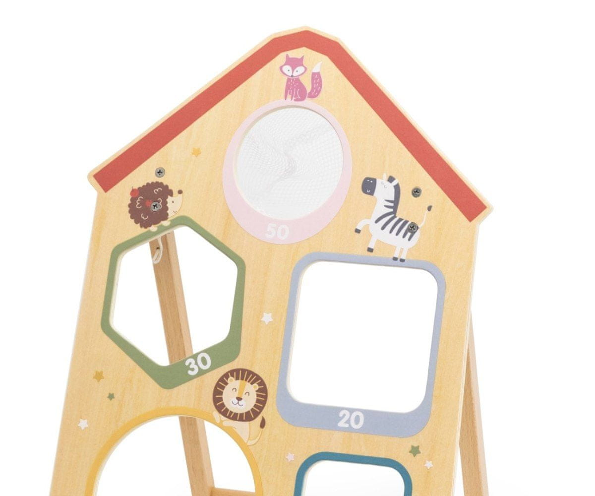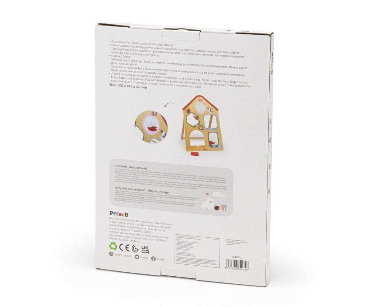 Viga 44272 PolarB Spretnostna igra – Metanje na tarčo je odlična igrača za otroke, ki jim omogoča, da na zabaven način razvijajo motorične sposobnosti in koordinacijo rok in oči. Igra je sestavljena iz trdnega lesenega okvirja s štirimi luknjami različnih oblik in vrednosti točk: od 10 do 50 točk. Priložene so tri mehke vrečke za metanje, ki omogočajo individualno ali skupinsko igro . Zaradi preprostih pravil je igra primerna tako za mlajše kot starejše otroke, spodbuja tekmovanje in skupno igro s sorojenci in prijatelji. Vrečke so shranjene v priročnem mrežastem žepu, nameščenem na eni od lukenj, zaradi česar jih je po igri enostavno organizirati. Zložljiv okvir omogoča enostavno prenašanje in shranjevanje igre, njena zasnova pa omogoča hitro igranje kjer koli – doma, na vrtu ali dvorišču.