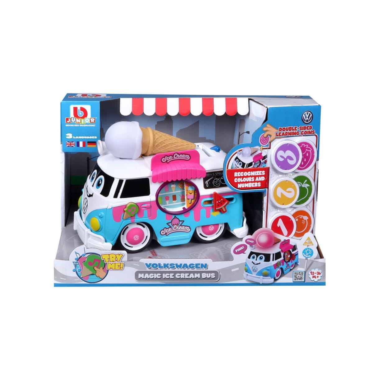 Ta avtobus Volkswagen Samba, preoblikovan v očarljiv kombi za sladoled, otrokom ponuja zabavno in poučno izkušnjo Preprosto spustite enega od pisanih kovancev skozi odprtino v strehi in opazujte, kako sladoled spreminja barve, ter slišite njegova imena Premikanje lubenice razkrije razpoložljive okuse, pritisk na gumb za glasbeno noto pa aktivira melodije in lučke Komplet vsebuje šest kovancev, oštevilčenih od 1 do 6, potrebuje tri baterije AAA in je dolg 20 cm Igrača je primerna za otroke, stare od 12 do 36 mesecev
