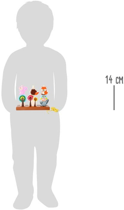 Ta komplet omogoča, da se kosi nanizajo na vrvico ali lesene žebljičke. Glavni liki te igre so jež, lisica, veverica, rakun in sova. Gozdno vzdušje dopolnjujejo 3 drevesa. Usposabljanje se lahko začne! Glavne značilnosti.