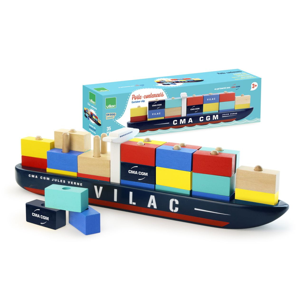 Kontejnerska ladja Jules Verne CMA CGM, ki je v celoti izdelana iz lesa. Ladjo naložite s kontejnerji in jo pripravite na plovbo. Igrača je primerna tudi za dekoracijo. Vsebuje 35 kosov. Glavne značilnosti: vsebuje 35 delovuči fino motoriko otrokprimerna tudi kot dekoracija