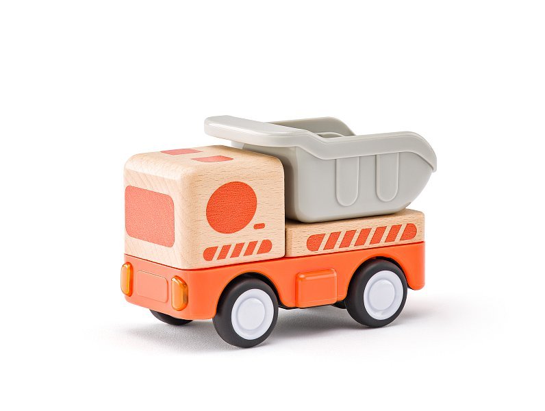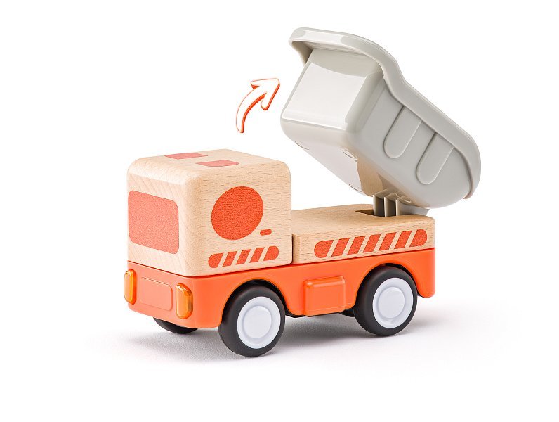 Avtomobil z vztrajnikom Narejen iz masivnega lesa Oblikovan tako, da se natančno prilega majhni otroški roki Opremljen s svetlobo in zvokom Plastično vedro na strehi tovornjaka je na tečajih Priložene so 3× baterije LR44 1,5 V