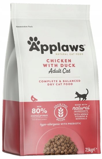 Applaws suha hrana za mačke je edinstvena popolna formula prehrane, ki posnema naravno hrano, ki jo mačke jedo v divjini. Mačke so mesojedci in njihov prebavni sistem je usmerjen na meso. Suha mačja hrana Applaws vsebuje veliko živalskih beljakovin brez visokih ravni ogljikovih hidratov in dodatkov iz žit, ki jih najdemo v drugi hrani. Zaradi tega je mačja hrana Applaws hipoalergena, saj ne vsebuje pogostih alergenov, kot so soja, pšenica, koruza ali druga žita. Vsebuje mešanico antioksidantov, vključno s selenom, naravnim tokoferolom (vitamin E) in rožmarinovim oljem. Naravne omega 3 in 6 maščobne kisline podpirajo stanje dlake. Izvleček brusnice čisti sečila in podpira prebavni sistem. Naravni prebiotiki podpirajo rast bakterij, potrebnih za pravilno delovanje prebave. Hrana vsebuje formulo proti izpadanju dlake. Suha hrana Applaws ima idealno razmerje med kalcijem in fosforjem, kar 100 % ustreza priporočilom in omejitvam FEDIAF.