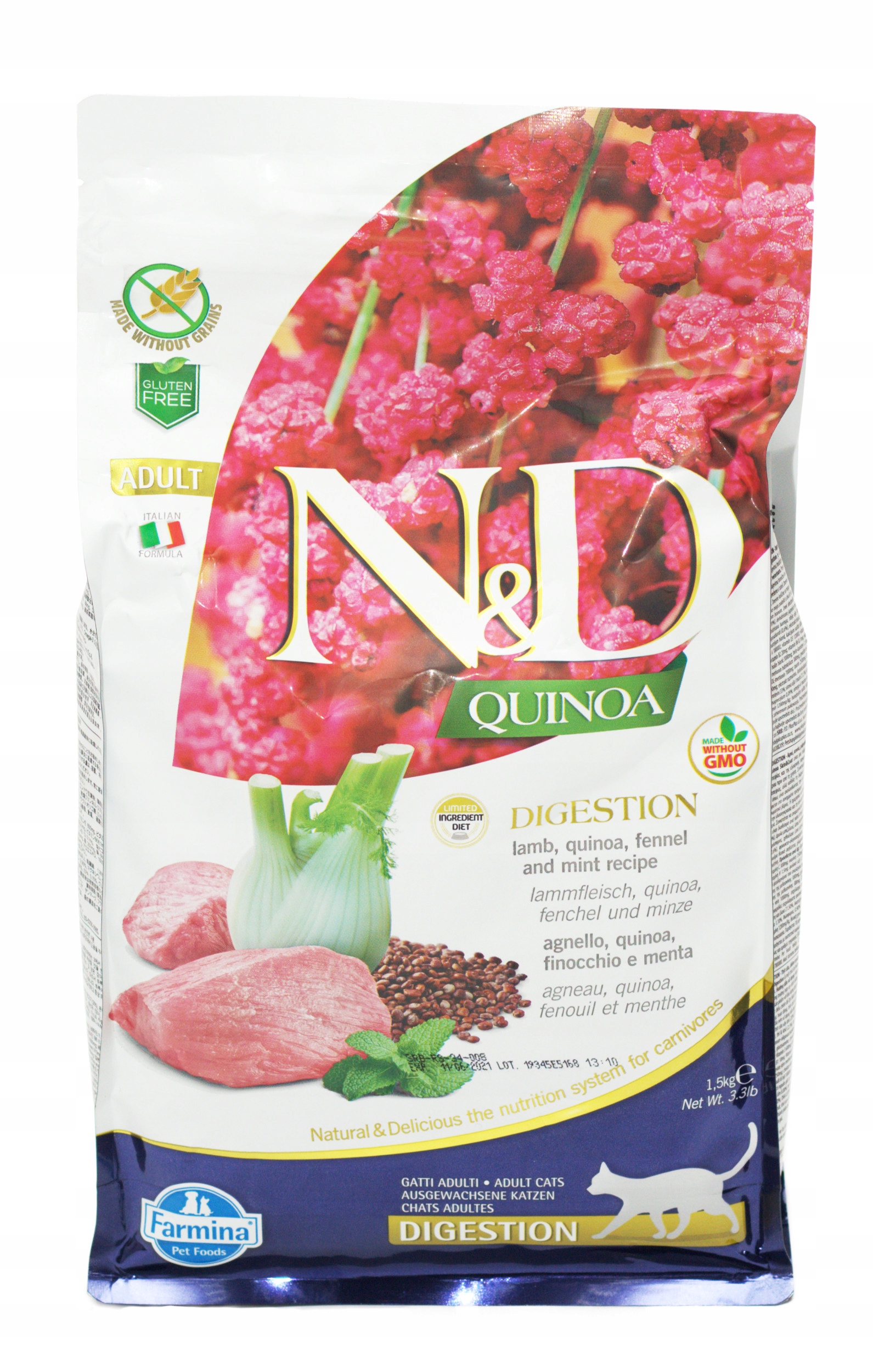 Popolna serija hrane Farmina N&D Quinoa je bila ustvarjena z mislijo na naravne potrebe mačk. Izdelana je iz najkakovostnejših sestavin, vključno z več kot 60 % živalskega izvora, ter kvinoje, zelenjave in sadja z edinstvenimi prehranskimi lastnostmi. Kvinoja ne vsebuje glutena, podpira prebavo in absorpcijo hranil v črevesju, je vir dragocenih aminokislin, mineralov in naravnih antioksidantov, ima nizek glikemični indeks ter podpira zdrav srčno-žilni sistem. Recept z jagnjetino, kvinojo, komarčkom in meto. Popolna hrana za odrasle mačke. Farmina N&D Quinoa Digestion je popolna dietetična hrana za mačke, priporočljiva za zdravljenje prebavnih motenj in eksokrine insuficience trebušne slinavke.