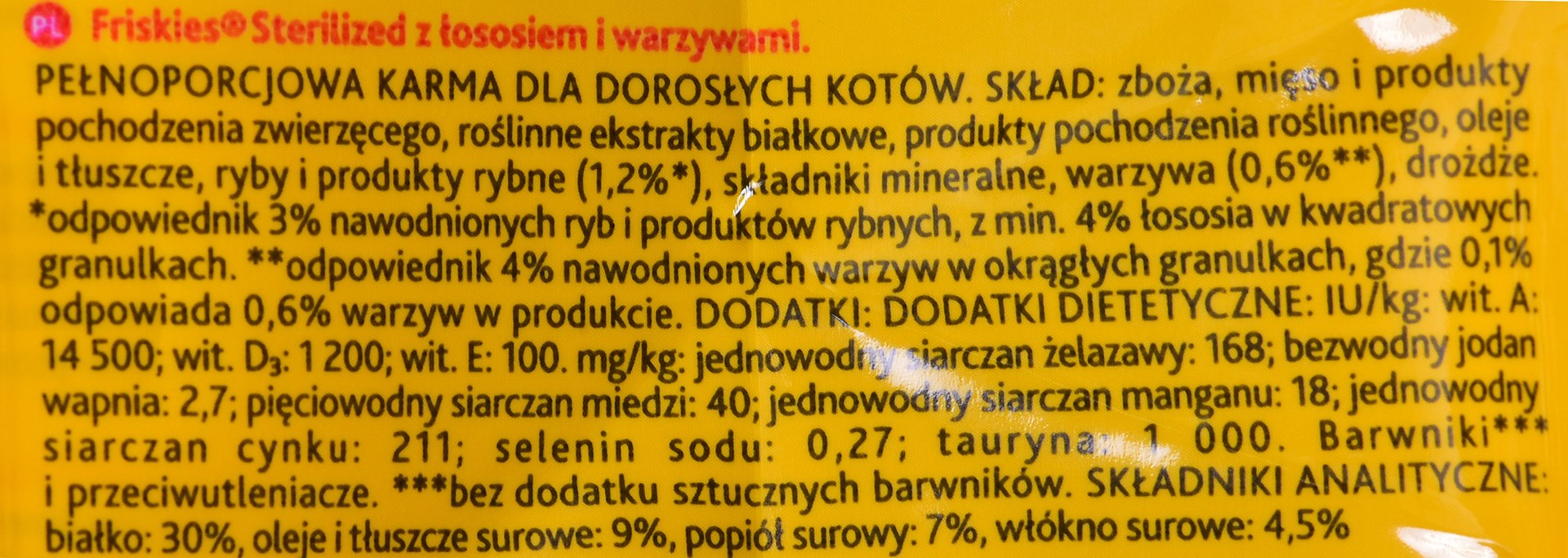FRISKIES sterilna hrana za mačke – losos, zelenjava je okusna hrana, ustvarjena s posebnimi potrebami kastriranih in steriliziranih mačk vseh pasem. Najkakovostnejše sestavine in tradicionalna receptura proizvodnje zagotavljajo vrhunski obrok, ki bo skrbel za telo vašega ljubljenčka. Posebne lastnosti hrane, ki spodbujajo zdravje, podpirajo dobro počutje vaše mačke, katere telo se spreminja po veterinarskem posegu.
