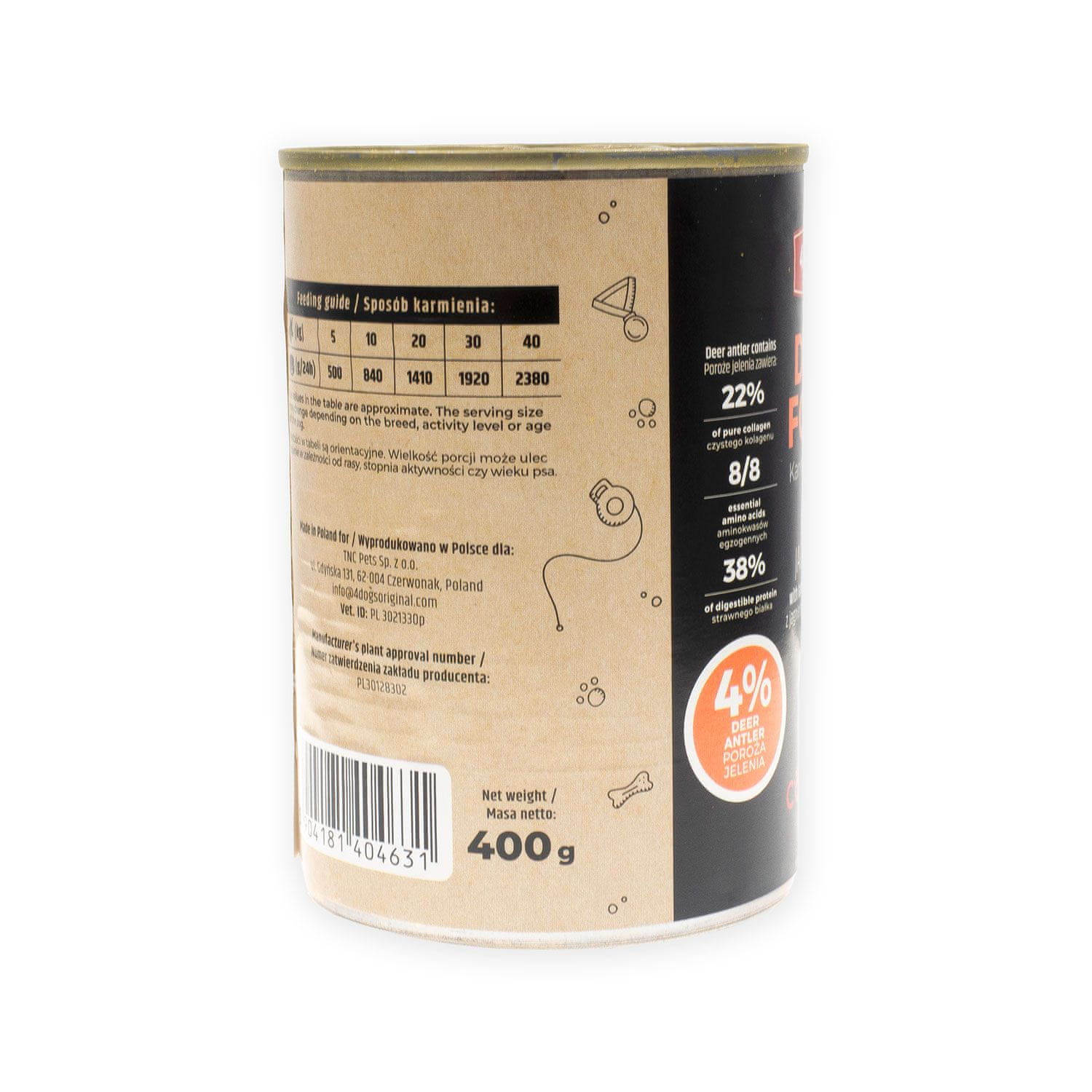 Linija 4DOGS Collagen je popolna mokra hrana, ustvarjena z vsakodnevno prehrano psov v harmoniji z naravo. Vsaka pločevinka je kombinacija visokokakovostnih sestavin, preproste formule in dodatka naravnega kolagena, ki podpira sklepe, kožo in dlako vašega psa.
