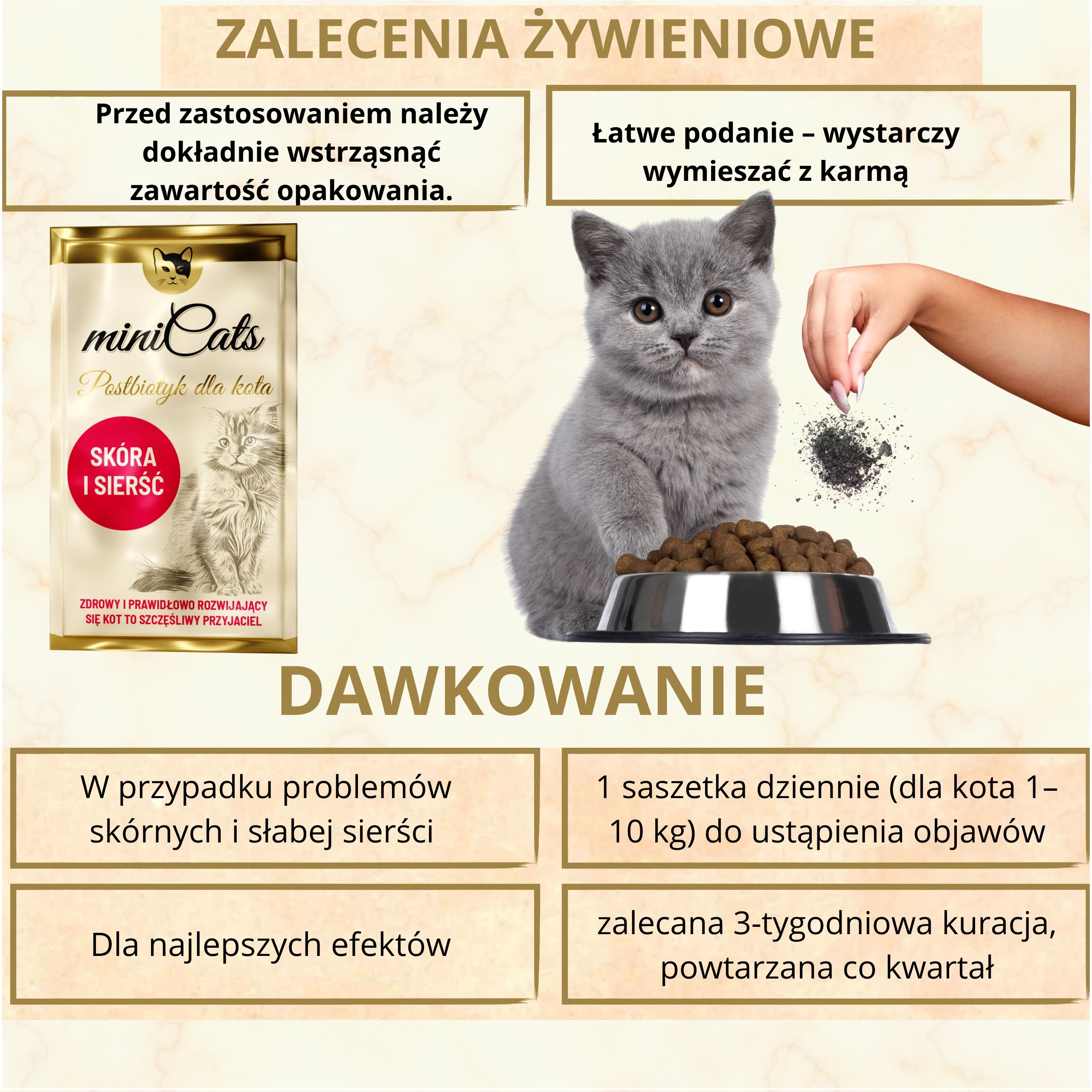 V primeru težav s kožo in slabe dlake ter kot preventivni ukrep – 1 vrečka dnevno (za mačko 1–10 kg), dokler simptomi ne izginejo.