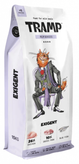 Tramp Premium Fly Exigent je vrhunska suha hrana, zasnovana za izbirčne in zahtevne mačke, ki potrebujejo bogato in uravnoteženo prehrano. Vsebuje kakovostne beljakovine iz dehidriranega piščanca in iberske svinjine, obogatena pa je z ribjim oljem, probiotiki, vitamini in minerali. Formula podpira zdravje kože, dlake, imunskega sistema ter vitalnost, hkrati pa spodbuja apetit tudi najbolj zahtevnih mačk.
