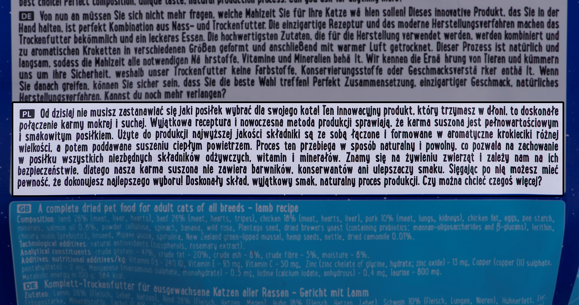 jagnjetina 26 % (meso, jetra, srca), govedina 26 % (meso, srca, želodci), piščanec 18 % (meso, srca, jetra), svinjina 10 % (meso, pljuča, ledvice), piščančja maščoba, jajca, grahov škrob, minerali, lososovo olje 0,8 %, celuloza v prahu, špinača, banana, šipek, semena indijskega trpotca, posušen pivski kvas (vsebuje prebiotike: mananoligosaharide in β-glukane), lecitin, inulin iz cikorije (prebiotik), laneno seme, mojavejska juka, spirulina, novozelandska zelenoustna klapavica, konopljina semena, kopriva, posušena kamilica 0,01 %.