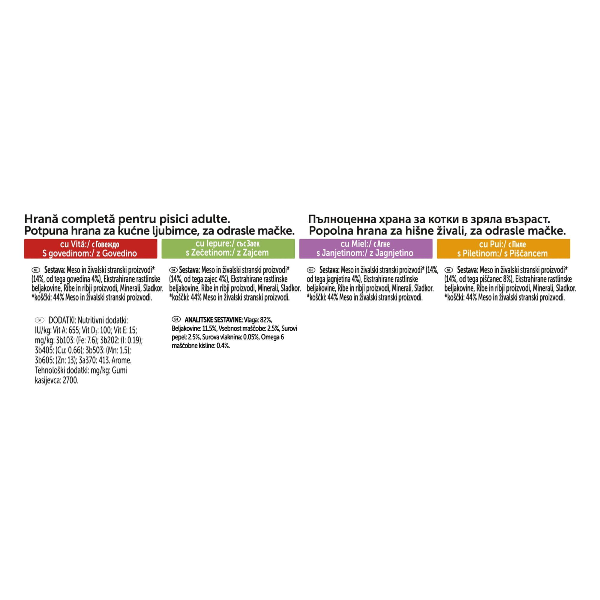 | Okus | govedina, piščanec, zajec in jagnjetina |