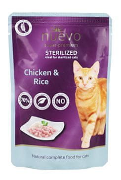 Nuevo sterilizirana perutninska hrana z rižem je popolna hrana za kastrirane mačke vseh pasem, obogatena s perutninskim mesom z rižem. Zaradi visoke vsebnosti mesa in naravnih sestavin, brez umetnih dodatkov, zrn ali glutena je ta hrana resnično kakovosten priboljšek, ki bo všeč tudi najbolj izbirčnim mačkam!