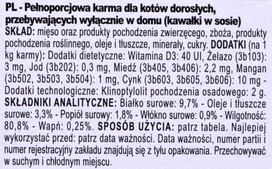 Ta mokra hrana vsebuje pusto meso in omogoča uravnotežen vnos hranil, ki so nujna za njihovo dobro počutje. Z nizko vsebnostjo maščob 3.3% in visoko vsebnostjo vlage 80,8% je odlična izbira, ki pripomore k hidraciji in podpori zdravega in aktivnega življenjskega sloga. Protein predstavlja 9,7%, kar omogoča ustrezno prehransko ravnotežje za odrasle mačke.