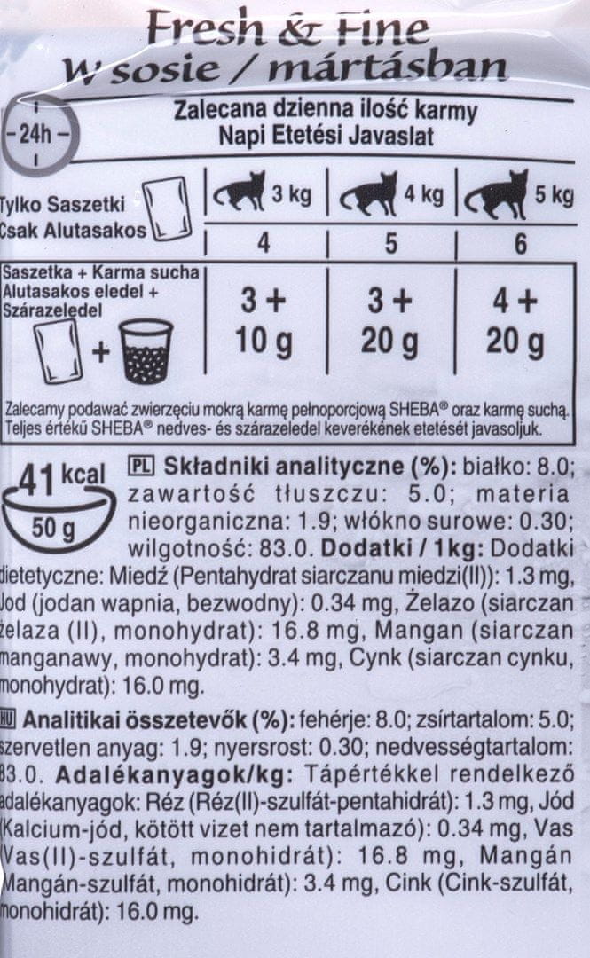 Sheba se ponaša s certifikati CE in Waltham, kar zagotavlja visoko kakovost in varnost. Mokra hrana vsebuje 8% beljakovin in je zasnovana za zadostitev prehranskim potrebam starejših mačk. Z vsebnostjo maščobe 5% in vlaknin 0.3%, je uravnotežena in primerna za splošno zdravje vaše mačke. Poleg tega je obogatena z minerali, kot so cink, železo, baker in mangan, ki prispevajo k optimalnemu zdravju vašega ljubljenčka.