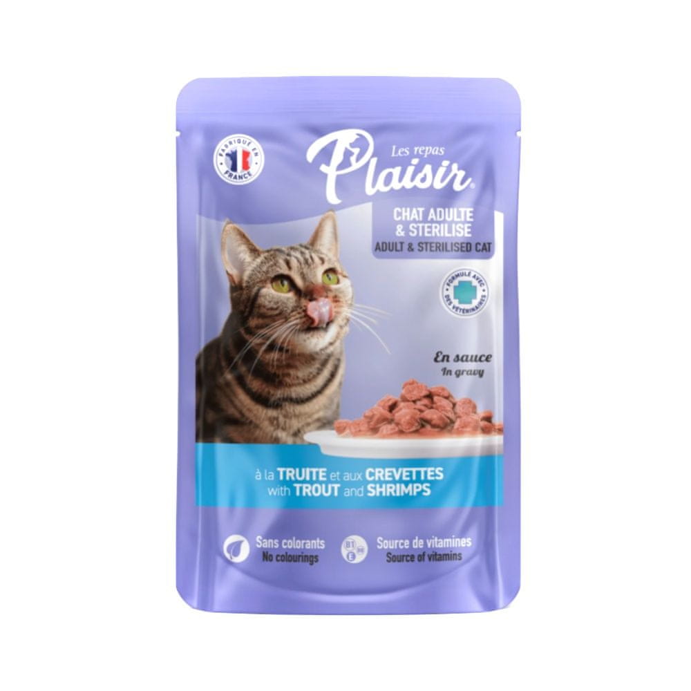 Popolna mokra hrana za odrasle mačke. Sočen mesni žepek s postrvjo in kozicami.