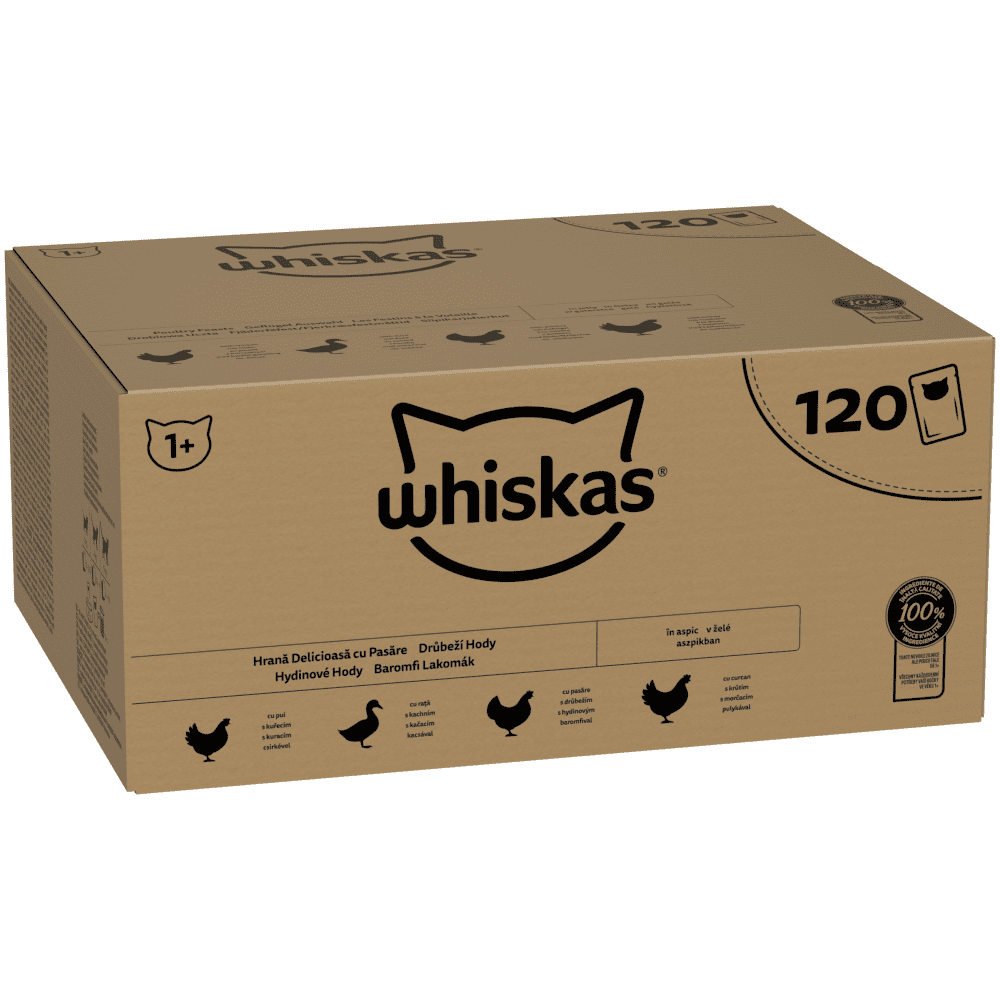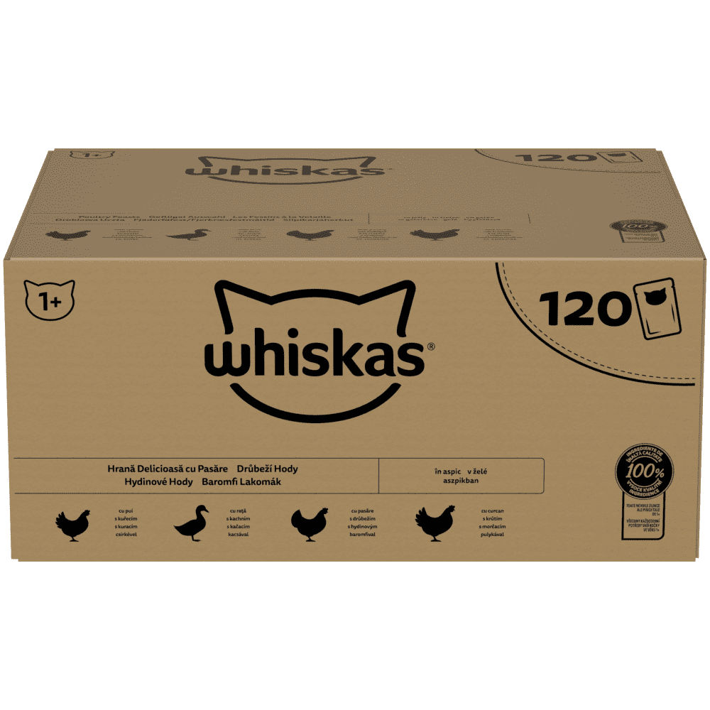 Whiskas vrečke perutninski izbor v želeju za odrasle mačke 120 × 85 g. Zahvaljujoč posebni pripravi in naravnemu okusu visokokakovostnih sestavin bo naša priljubljena hrana vašo mačko pritegnila k skledi hitreje kot kadar koli prej! Od igrivih mačjih mladičev do starejših hišnih ljubljenčkov, naši okusni recepti so zasnovani tako, da poskrbijo za veselje predečih v vseh starostih … med obroki in pozneje. Celoten opis