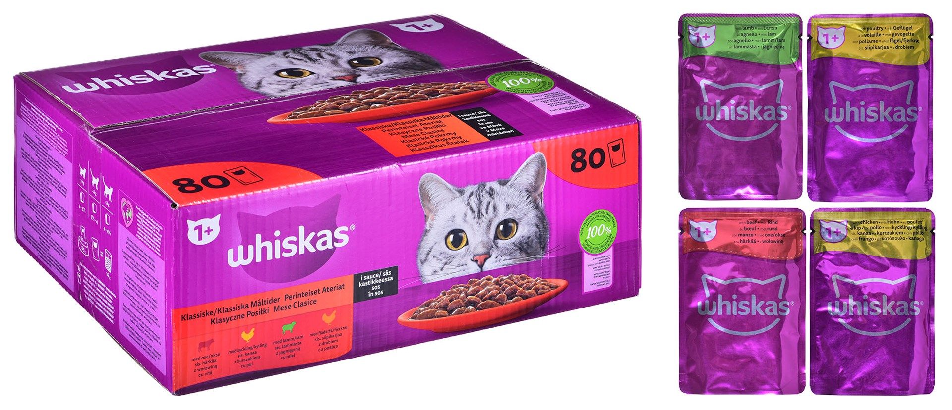 WHISKAS Klasična mokra hrana za mačke v omaki je idealna izbira za odrasle mačke vseh pasem, ki iščejo okusen in hranilen obrok. V pakiranju se nahaja 80 sachetov po 85 g, z različnimi okusi piščanca in jagnjetine, ki zadovoljijo še tako zahtevne brbončice vašega hišnega ljubljenčka.