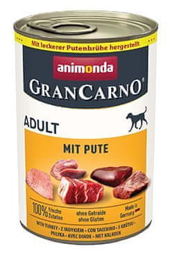 Animonda GranCarno Aduloptimalno uravnotežena in okusna hrana za odrasle pse, stare od 1 do 6 letNarejena iz svežega mesa in drobovine – z vidnimi koščki mesaMilen okus po puranu – prava poslasticaBrez žitaric, glutena, soje in sladkorjaBrez umetnih barvil in konzervansovIntegriteta: 53 % svinjine ( Celoten opis