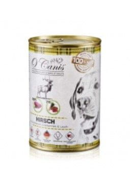 O'Canis Jelen z ajdo, brusnicami in drobnjakom je popolna hrana iz naravnih sestavin, brez umetnih arom, tujih beljakovin, konzervansov in barvil. Zaradi nežne predelave je ta mokra hrana izjemno nedražeča, kar zagotavlja visoko stopnjo tolerance in lahko prebavljivost. Visoka biološka uporabnost zagotavlja nizko porabo hrane. Ta hrana je izdelek v lastnem soku s svežim mesom in je idealna za pse vseh starosti. Sestavljena je iz štirih sestavin, zaradi česar je primerna za pse z alergijami in občutljivim prebavnim sistemom. Uporablja se lahko pod veterinarskim nadzorom kot del izključitvene diete.