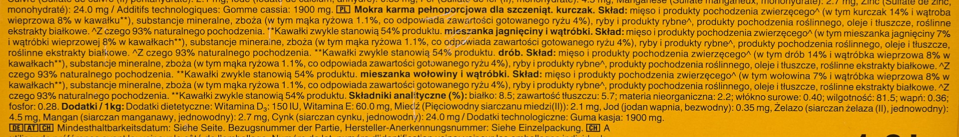 Koščki, bogati z mešanico jagnjetine in jeter – meso in živalski derivati (44 %, 95 % naravnega izvora^; vključno z mešanico jagnjetine 7 % in svinjskih jeter 8 % v kosih), minerali (1,4 %), žita (vključno z riževo moko 1,1 %, kar ustreza 4 % kuhanega riža), ribe in ribji derivati^, olja in maščobe, derivati rastlinskega izvora^, izvlečki rastlinskih beljakovin. ^Sestavine naravnega izvora. **Koščki običajno predstavljajo 54 % izdelka.