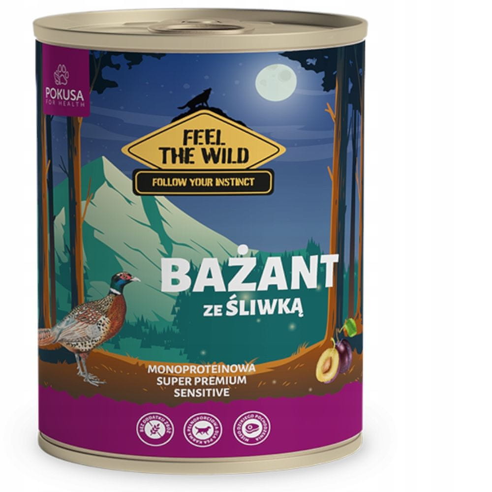 Hrana Feel The Wild – Fazan s slivami – med drugim vsebuje: fazanovo meso – odličen vir beljakovin, fosforja, magnezija in lahko prebavljivega železa; Vsebuje vitamine skupine B: B2, B3, B5, B6 suhe slive – odlično vplivajo na pravilno delovanje prebavnega sistema, zaradi visoke vsebnosti vlaknin, ki preprečujejo absorpcijo holesterola