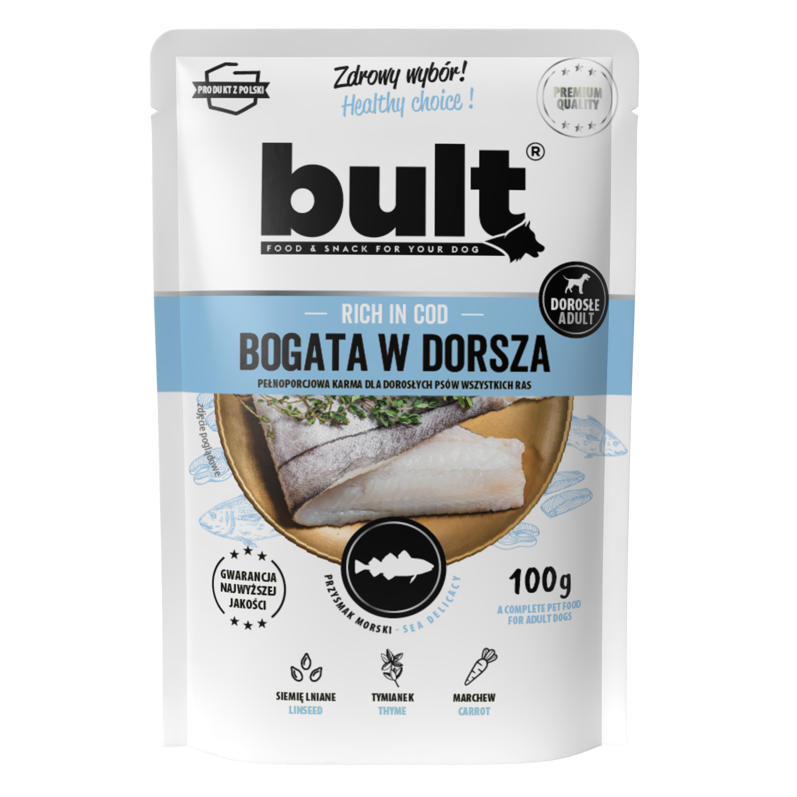 Popolna vrečka BULT, bogata s trsko , ima visoko vsebnost omega-3 in omega-6 maščobnih kislin, ki spodbujajo zdravo kožo in sijočo dlako. Dodatek timijana izboljša okusnost hrane in podpira imunski sistem vašega ljubljenčka. Vrečka BULT, bogata s trsko, vsebuje tudi laneno seme, ki preprečuje zaprtje, in korenje, naravni antioksidant. Ta hrana je primerna za odrasle pse vseh pasem. Priročna embalaža omogoča enostavno odpiranje in shranjevanje. Na voljo v pakiranjih: 100 g in 500 g.