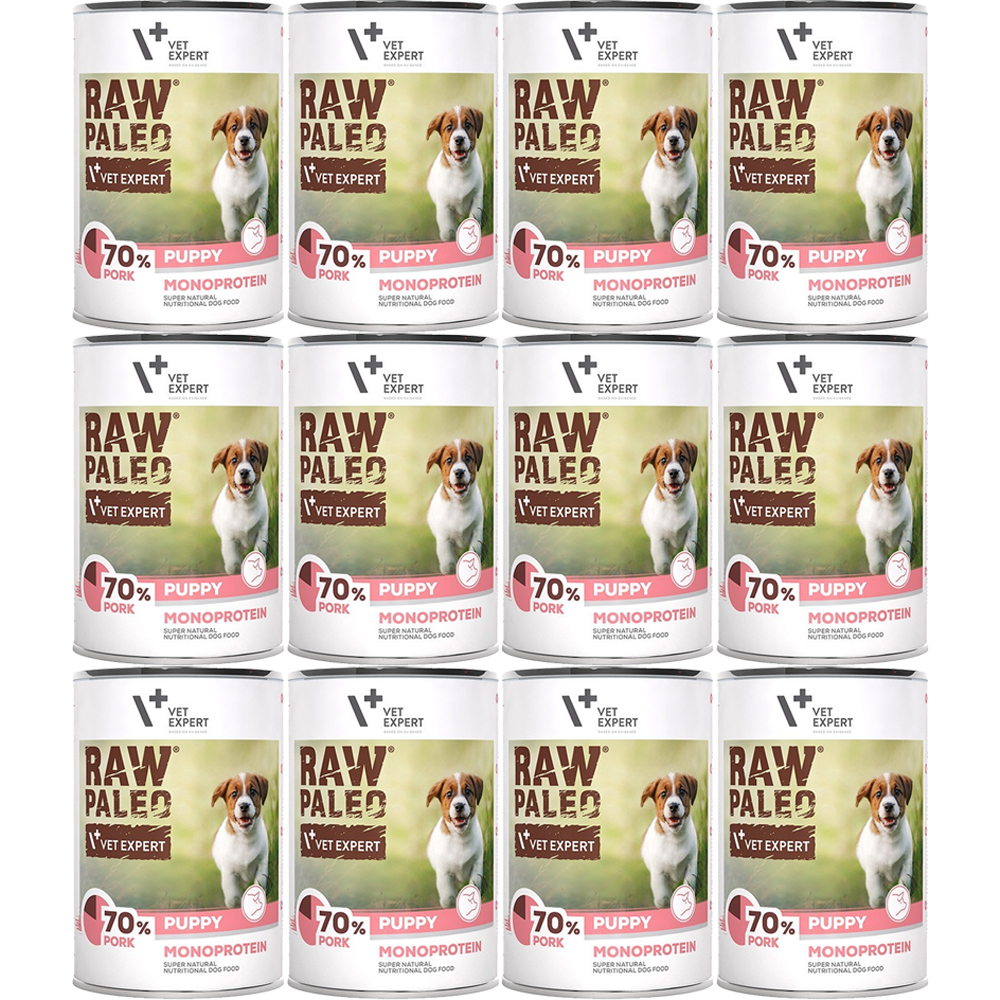 VetExpert konzerva za mladičke s surovo paleo svinjino 12 × 400 g Celoten opis
