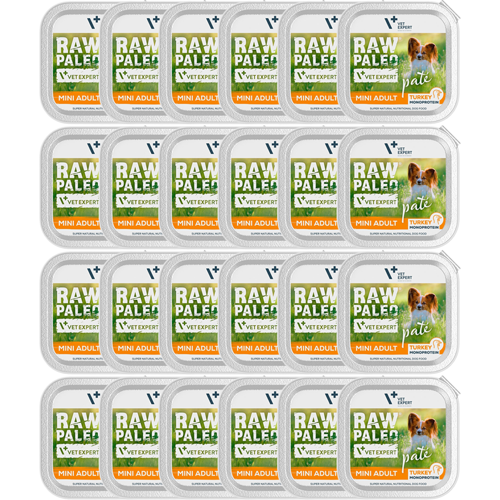 VET EXPERT Raw Paleo Puranja pašteta Mini Adult je popolna mokra hrana, posebej zasnovana za odrasle pse majhnih pasem. Njena osnova je nežno puranje meso, ki je lahko prebavljivo, bogato z dragocenimi beljakovinami in ga zlahka absorbirajo tudi psi z občutljivim prebavnim sistemom. Formulo Raw Paleo so ustvarili veterinarji, da bi v celoti zadovoljili prehranske potrebe majhnih psov – jim vsak dan zagotavljali energijo, zdravje in vitalnost. Hrana ne vsebuje žit, umetnih konzervansov, barvil in glutena, zato je primerna tudi za pse z alergijami na hrano ali intolerancami. Zahvaljujoč nežni, gladki konsistenci paštete je obrok izjemno okusen in ga z veseljem pojedo tudi izbirčni psi. Vsebnost vitaminov in mineralov podpira imunski sistem, zdravo kožo in dlako ter pravilno delovanje celotnega telesa. To je naravna, zdrava in okusna prehrana za majhne odrasle pse.