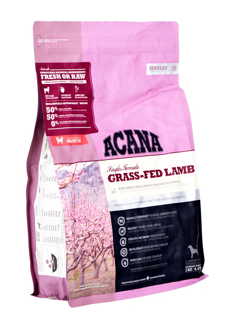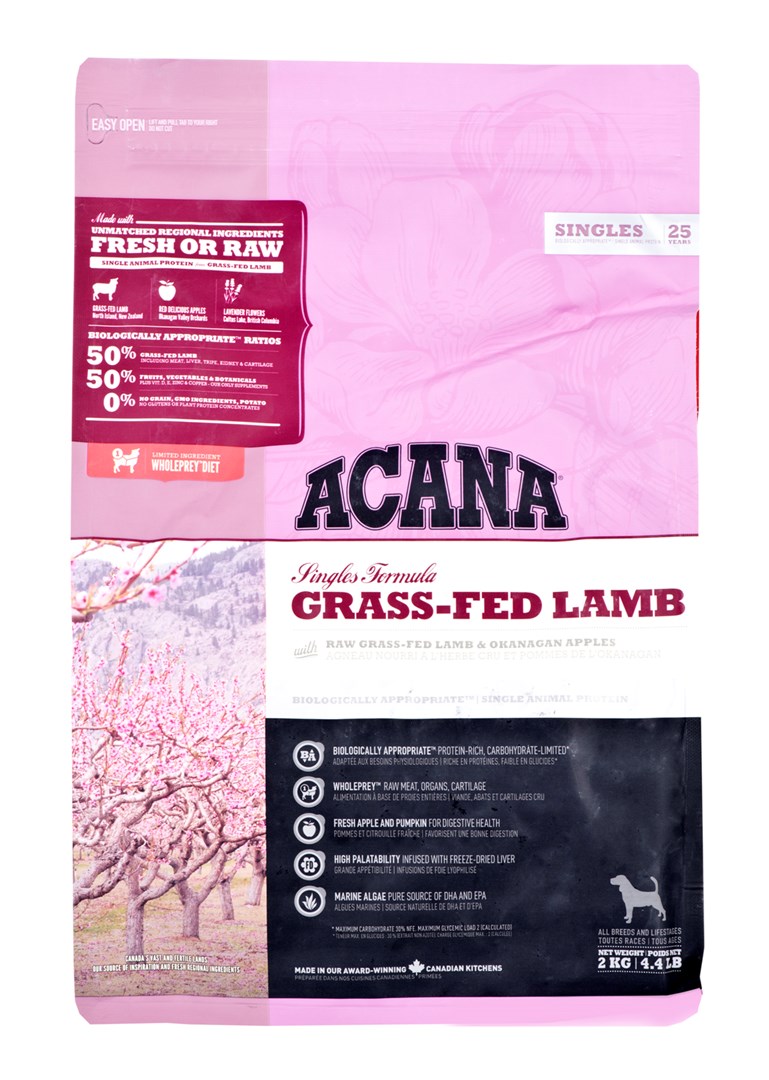 ACANA Jagnjetina, hranjena s travo Suha hrana ACANA za pse, hranjene s travo, z monoproteini, je idealna za hišne ljubljenčke, ki se spopadajo s prehranskimi intolerancami in alergijami. Edinstvena receptura na osnovi sveže novozelandske jagnjetine zagotavlja biološko ustrezen obrok in zmanjšuje tveganje za alergijsko reakcijo. Jagnjetina je zelo prebavljiva, kar dodatno pomaga skrbeti za občutljiv želodec vašega ljubljenčka. Dodatek vlaknin iz buče, svežih rdečih jabolk ter druge zelenjave in sadja podpira prebavo in olajša odvajanje blata.
