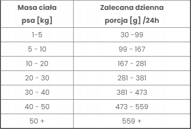 Dnevne potrebe, navedene v tabeli, so okvirne. Prehranske potrebe se lahko razlikujejo glede na pasmo, starost, temperament in stopnjo aktivnosti živali. Priporočljivo je, da dnevni odmerek hrane razdelite na dva obroka.