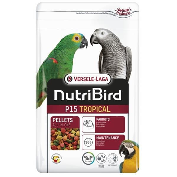 Večbarvni ekstrudirani peleti NutriBird P15 Tropical imajo znanstveno razvito formulo z vsemi hranili, ki jih potrebujejo velike papige. Vsak pelet je hranilno popoln – hrana tako preprečuje selektivno izbiranje določenih sestavin hrane. Opti Digest: z naravnimi glinenimi minerali in prebiotiki za zdravje črevesnega mikrobioma in optimalno prebavo. Opti Feather: vsa potrebna hranila za lepo perje. Opti Calcium: optimalno razmerje med kalcijem in fosforjem za zdravje kosti. Glavne prednosti hrane: