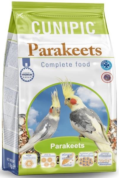 Cunipic Parakeets – popolna hrana, bogata z vitamini in železom, posebej oblikovana za srednje velike papige (kot so Corellas, Male Alexandre ali Rosella). Vsebuje 14 vrst semen. Hrana je bogata z vitamini A,B1,B2,B6, B12, D, E, K in ogljikovimi hidrati; obogatena je s kalijem in spodbuja zdravo in sijoče perje. Vitamini so hrani dodani v obliki pršila na posamezna zrna, kar zagotavlja, da ptica vitamine zaužije. Sestavine, Vitamin D3 750 m.j., vitamin E 13 mg. Analitične sestavine: surove beljakovine 12,4 %, surova olja in maščobe 8,9 %, surova vlaknina 11,2 %, surovi pepel 4,7 %, kalcij 0,62 %, fosfor 0,37 %. Priporočeni dnevni odmerek 10 g/dan. Krmi lahko dodate zelenjavo, sadje, jajčno hrano in ptičji pesek.