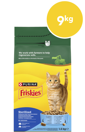 Izbira hrane Friskies® je odločitev, ki ji lahko popolnoma zaupate, saj zagotavlja 100 % popolno in uravnoteženo prehrano. Receptura Sterilised je posebej oblikovana, da vaši kastrirani mački zagotovi vso potrebno energijo in hranilne snovi.