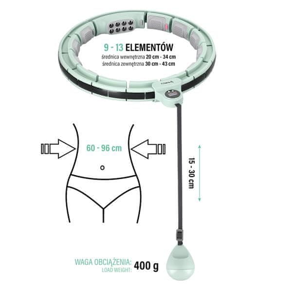 HHM13 ima skupaj 13 elementov, ki jih lahko poljubno spreminjate in tako uravnavate obseg kolesa. Velikost je postavljena v razponu od 9 do 13 elementov, kar pomeni obseg pasu od 60 do 96 cm. Poleg tega s prilagajanjem dolžine pasu gravity ball nadzorujete stopnjo zahtevnosti vaj. Daljši trak poveča intenzivnost vaše vadbe.