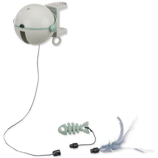 • Igrača, pritrjena na vrvico, se nepravilno premika gor, dol in tako izzove mačko k igri.