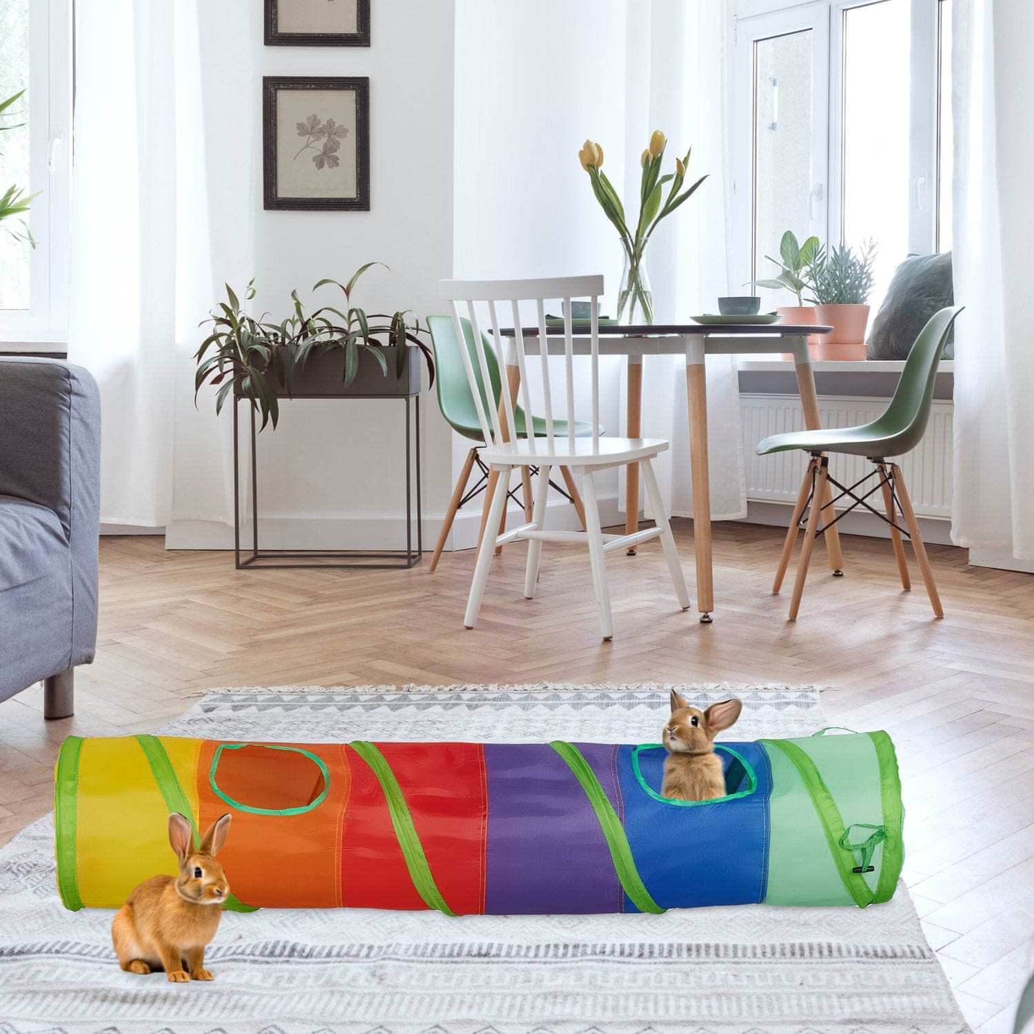 Odkrijte popolno igrišče za svojo mačko z našim zložljivim tunelom za mačke v mavričnem dizajnu. Ta barvita mačja igrača ponuja neskončne možnosti za igro, lov in skrivanje. Z dvema dodatnima luknjama lahko vaša radovedna mačka pokuka ven in raziskuje okolico. Zahvaljujoč izskočni funkciji lahko ta mačji tunel hitro in enostavno postavite in ga enostavno prenašate v priloženi torbici. Ta mačji tunel je izdelan iz materiala, ki ga je enostavno vzdrževati in ga je mogoče enostavno očistiti z vlažno krpo, zato je praktičen in zabaven za vašega štirinožnega prijatelja.