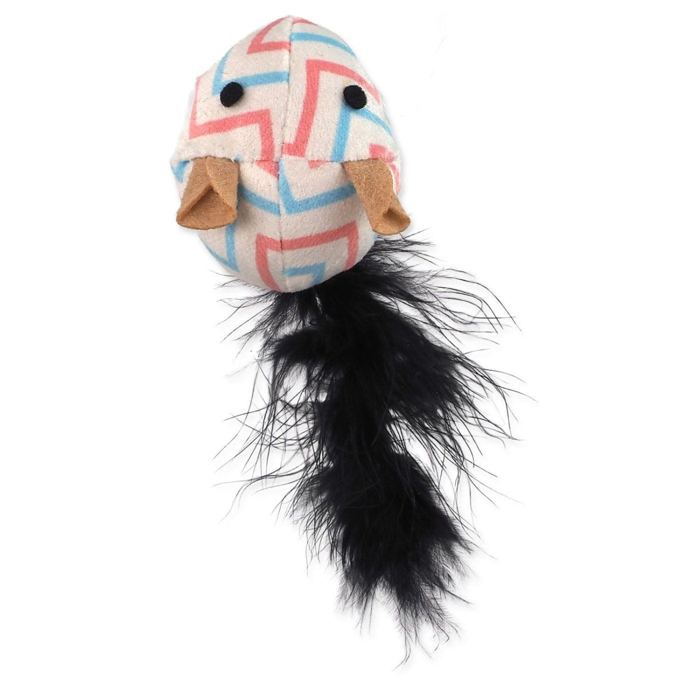 Privlačna igrača v obliki miške s perjem in mačjim ščegetavčkom.