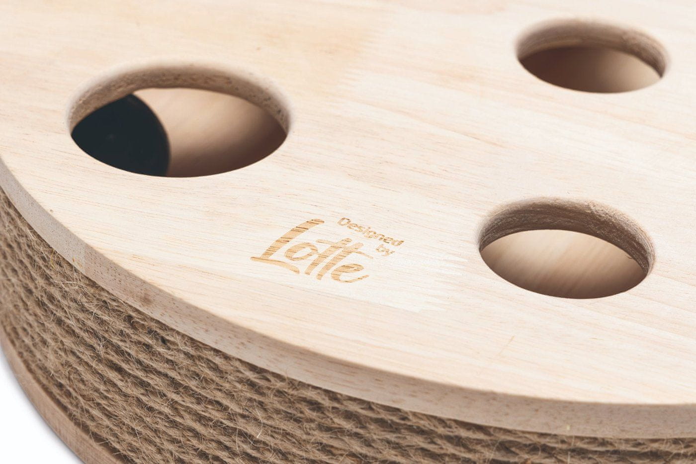 Raya by Designed by Lotte bo vašo mačko zabavala več ur. Igrača je izdelana iz gumijastega lesa in poleg vrvice za praskanje vsebuje več lukenj, ki vaši mački omogočajo premikanje 2 lesenih žogic, skritih v notranjosti. Vaša mačka bo rada lovila žogice, zaradi praskalnika bo lahko poskrbela za svoje kremplje, čista oblika te igrače pa bo odlično videti v vaši notranjosti. Za zaščito tal je igrača opremljena z zaščitnimi nogami