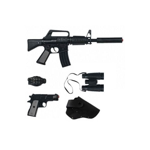 Komplet policijskih specialnih sil vključuje kovinsko policijsko pištolo, dušilec zvoka, daljnogled, policijsko značko, pištolistični kovček in policijsko avtomatsko pištolo. Vse je izdelano iz kovine. Vse je na kapice – osem strelov. Izdelano v Španiji. Starost: 4+