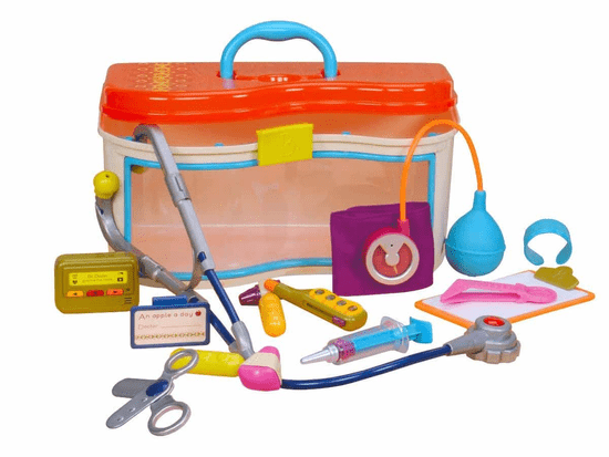 Priljubljena zdravniška igra se lahko začne! Vse, kar potrebuje mali zdravnik ali zdravnica, najdete v trpežnem kovčku Btoys z ročajem za prenašanje. Kovček vsebuje pisalno podlogo s papirjem, kladivo, otoskop, termometer, povoje, tablico z imenom, stetoskop z zvokom srčnega utripa, merilnik krvnega tlaka, pinceto, brizgo, varnostne škarje in zvočni signal.