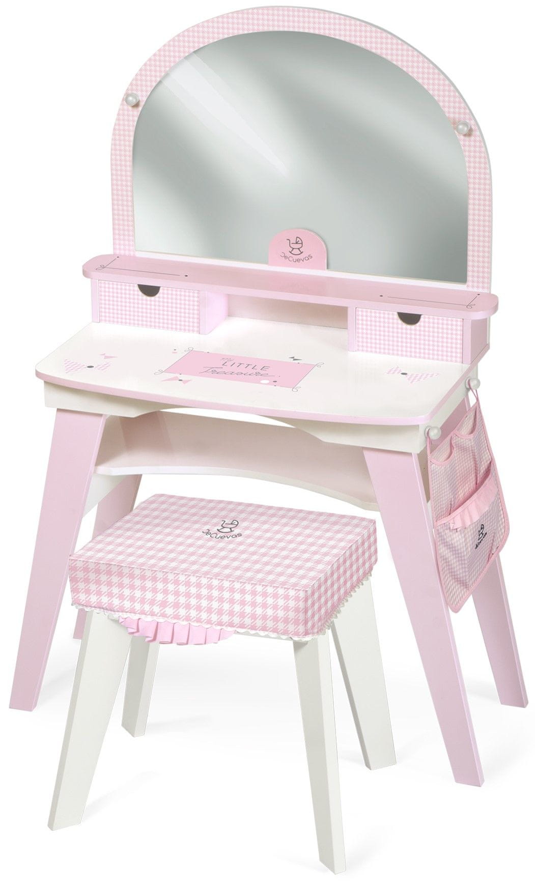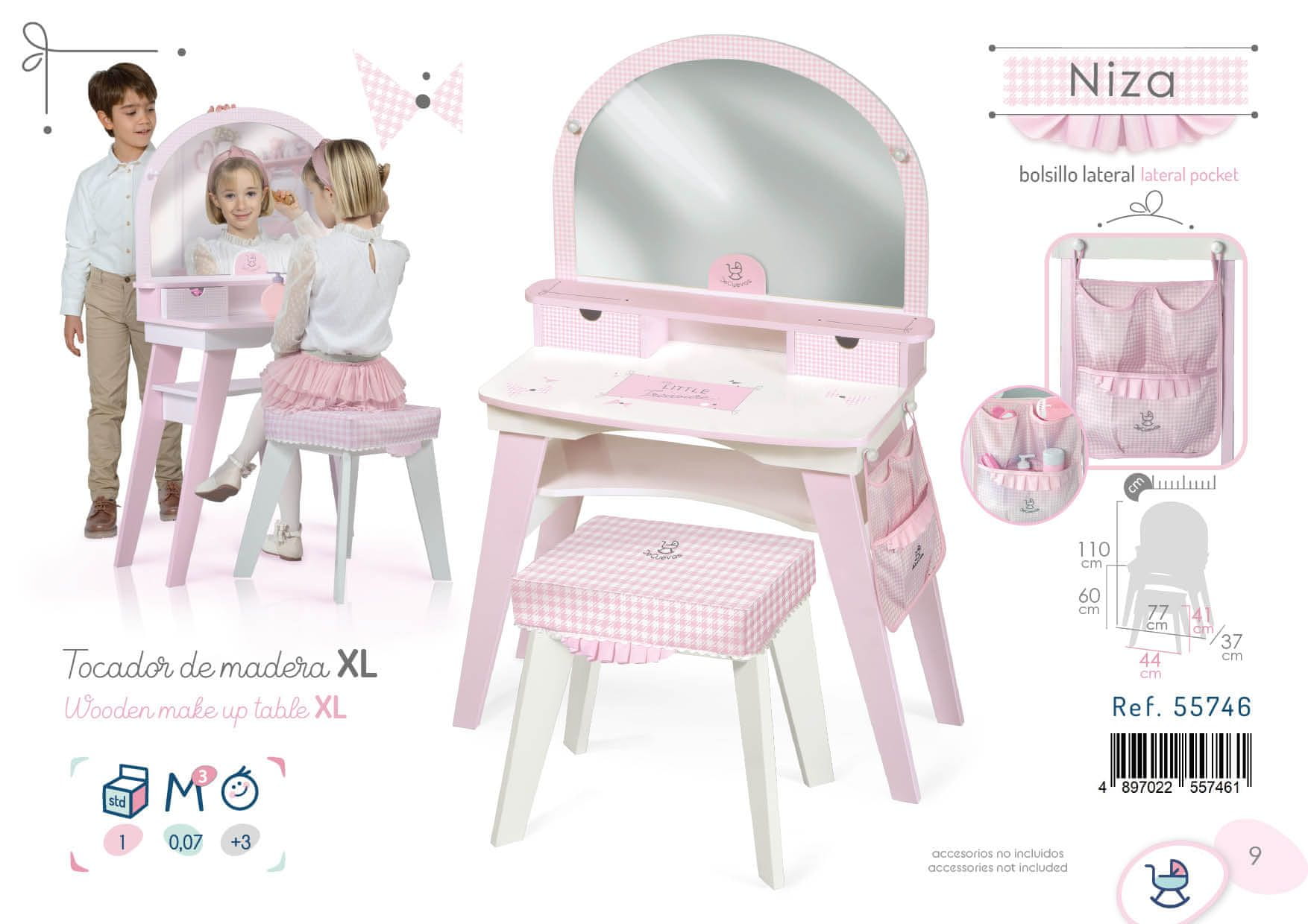Razveselite svojo malo lepotico z očarljivo toaletno mizico DeCuevas 55746 lesena toaletna mizica XL z ogledalom in lesenim stolčkom NIZA 2022 v nežni roza barvi. Stolček je izdelan iz MDF, masivnega lesa, plastike in kovine. Oprema vključuje tudi polico in žepe. Celoten opis